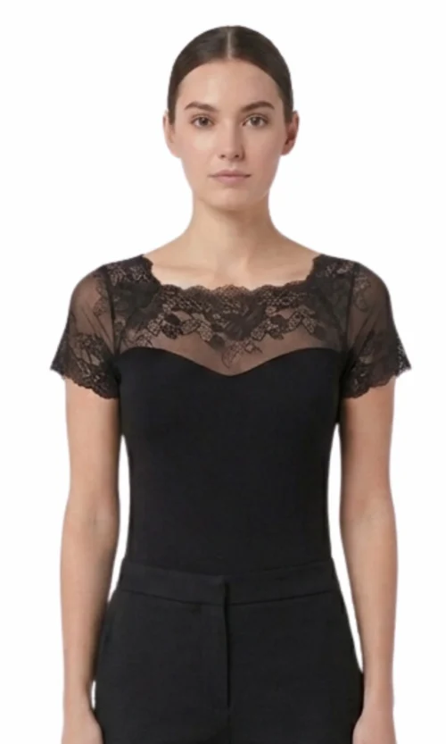 Top femme avec effet col illusion en dentelle transparente et manches courtes. Coupe structurée qui met en valeur la silhouette, idéal pour un look chic et habillé.