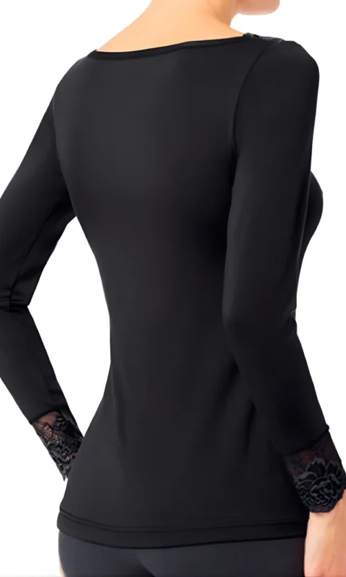 Top manches longues en modal doux et extensible avec dentelle florale. Confortable et élégant, parfait à porter en intérieur comme en extérieur.